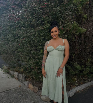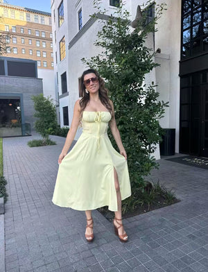 This dress was made for sunshine, sunset dinners, and everything after. The corset-inspired bodice defines your waist, while the flowing midi skirt keeps you cool, comfortable, and effortlessly elegant.